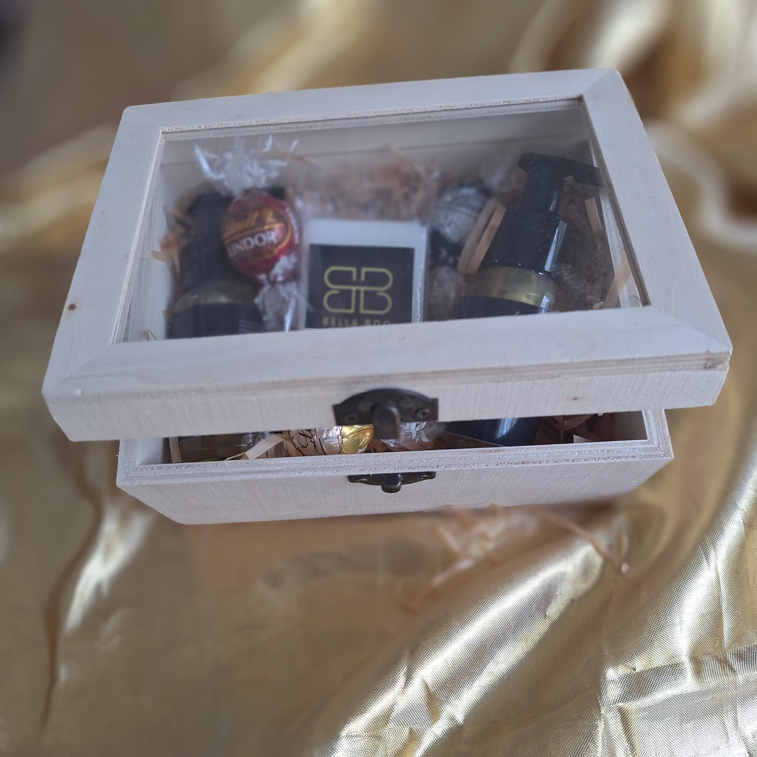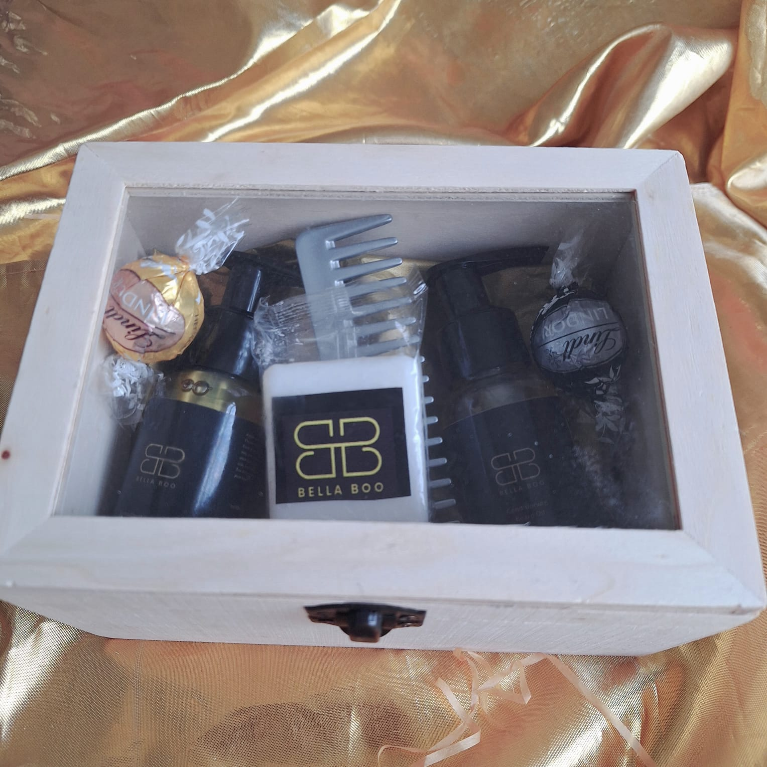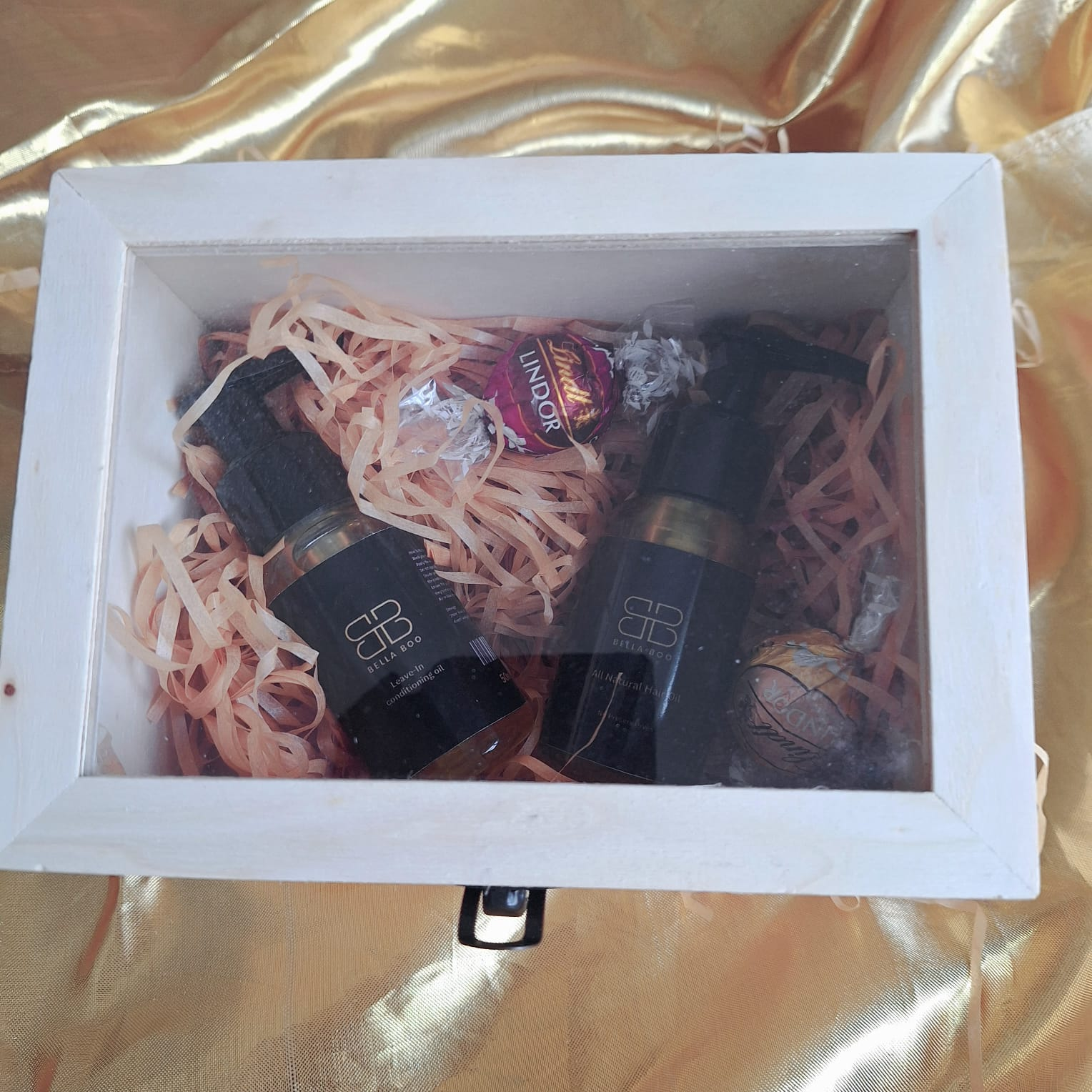 A beautifully curated gift box, crafted from light wood, is presented on a bed of shimmering gold silk. Inside, a luxurious pairing of Bella Boo’s leave-in conditioning oil and natural hair treatment rests upon a cushion of soft, shredded paper. The elegant black bottles are complemented by the decadent presence of two Lindt LINDOR truffles, offering a touch of blissful indulgence to this sophisticated collection.